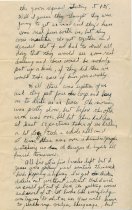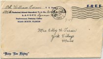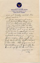 Handwritten letter dated July 19, 1942 from Private William (Bill) Turner, pilot in World War II, to his mother Mrs. Colby W. Turner. Bill is writing from Miami Beach, Florida to his mother in York Village, Maine. Written on A. A. F. T. T. C. (Army Air Forces Technical Training Command) stationery that has been crossed out and repalaced with "574th Aviation Cadets Miami Beach, FL." Transcription: 575th Aviation Cadets Miami Beach, FLORIDA July 19, 1942 Dear Mother, I shouldn't be writing to you but I feel in the mood and there is quite a bit to write about. I owe letters to three different girls but they'll have to wait. All I've got is 15 min. before the lights have to go out. We've been on guard three times this week but the Corp. went up to the Post Headquarters and put up a kick to the detail officer and they in turn gave Squadron Headqrts. hell. That was alright except that Headquarters immediately took away all our late passes except five and then this morning they framed us. You see the cadets haven't stood Revielle Sun. morning since they've been here. This morning the Permanent Party fellows came around five minutes late and made us get up then they told us that we were on the goon squad starting at 8:15. Well I guess they thought they were going to get us mad and they'd have some real fun with us, but they were mistaken. We got together and decided that if we had to drill all day that they would see some real drilling and there would be nobody put up a kick, if they did then we would take care of him personally. Well there was eighteen of us and they put four corp. and Serg. On to drill us in turn. The morning was pretty slow, but before the afternoon was over I'll bet there had been at least 50 pictures taken of us drilling a lot. Toby took a whole roll and at times there was over a hundred people watching us. Oh there go the lights I'll finish tomorrow. All I've got is five bucks left but I guess we're getting paid sometime this week, here's hoping anyway. I've got thirteen dollars out without interest. Good I wish we could get out of here it's getting worse and more of it. It looks like everybody was trying to shit on us. You will have to pardon my vulgar language, but I do get terribly mad at this place sometimes. I'm darn glad we got such a swell bunch of fellows though if it wasn't for that we'd all go nuts. I had some pictures taken the other night and am enclosing the best one that isn't so good, the hat I had on was to small for me and it makes me look screwy. When I get into Cadet School and get my officers uniform which we get the first thing I'll try to get a real good picture taken. Well if you can read this scribbling you'll do better than I, so I'll sign off till the next time. Your loving son "Willy" |